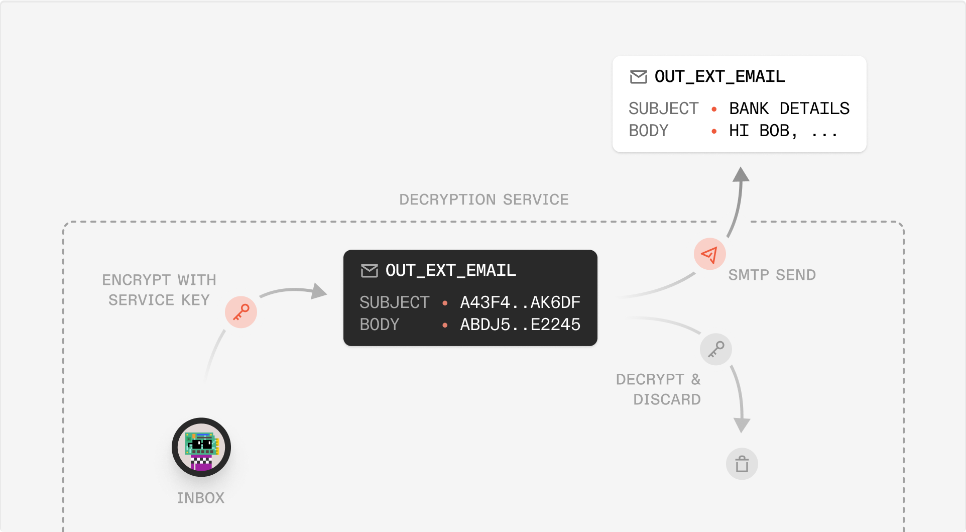 Now, when loading her Skiff inbox, Alice can decrypt the encrypted copy of emailin order to read the message. The encryption service discards and deletes its initial randomly generated copy of , now ensuring that every message inside Alice’s inbox remains end-to-end encrypted and completely private to her. This encryption step - taking the unencrypted, external email and transforming it into an encrypted message on Skiff Mail - ensures that Skiff never stores copies of users’ unencrypted mail, even when sent by an external service.